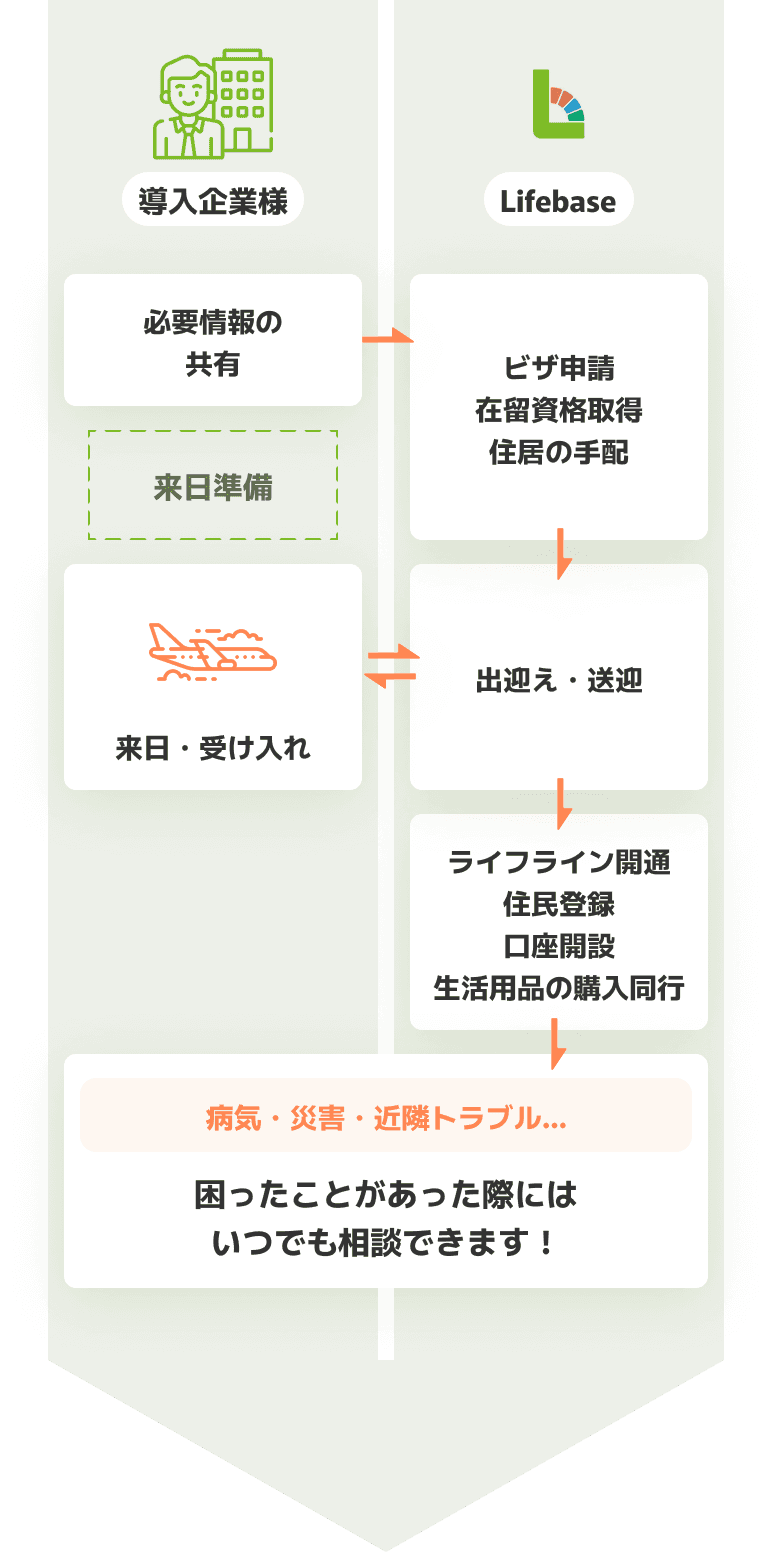 ビザ申請、在留資格取得、住居手配、初期生活サポート、日本語トレーニングまで、すべてをワンストップで提供し、企業と外国人IT人材双方の負担を軽減します。